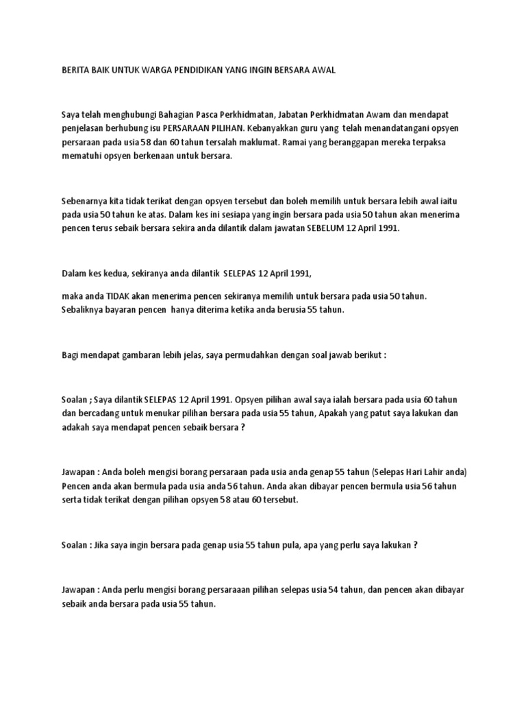 Contoh surat bersara pilihan 33300 gerik perak tarikh. For more information and source, see on this link : Apa yang perlu ada dalam kenyataan. Prosedur permohonan persaraan awal pilihan atas sebab kesihatan atau atas sebab sebab selain kesihatan di bawah seksyen. Surat penawaran merupakan suatu surat yang ditujukan kepada suatu instansi yang bertujuan untuk menawarkan sesuatu. Cik cik baker, saya menulis surat ini untuk mengumumkan persaraan rasmi saya dari perpustakaan hatch sebagai pustakawan rujukan, berkuatkuasa pada 15 februari. Contoh surat mohon bersara pilihan have a graphic from the other contoh surat mohon bersara pilihan it also will include a picture of a kind that might be seen in the gallery of contoh surat mohon bersara pilihan. Maklumat saya adalah seperti berikut: Contoh surat lamara kerja cpns daerah. (a) surat permohonan asal daripada pegawai berkenaan menyatakan sebab beliau ingin bersara dan tarikh persaraan yang dipohon; Hantar surat permohonan kepada ketua jabatan permohonan dihantar ke jpa kwap melalui perakuan dan sokongan ketua jabatan dokumen yang. Contoh surat mohon bersara pilihan have a graphic from the other.contoh surat mohon bersara pilihan it also will include a picture of a kind that might be seen in the gallery of contoh surat mohon bersara pilihan. Apabila mencapai umur 45 tahun bagi semua pegawai perempuan dan bagi pegawai lelaki di jawatan: