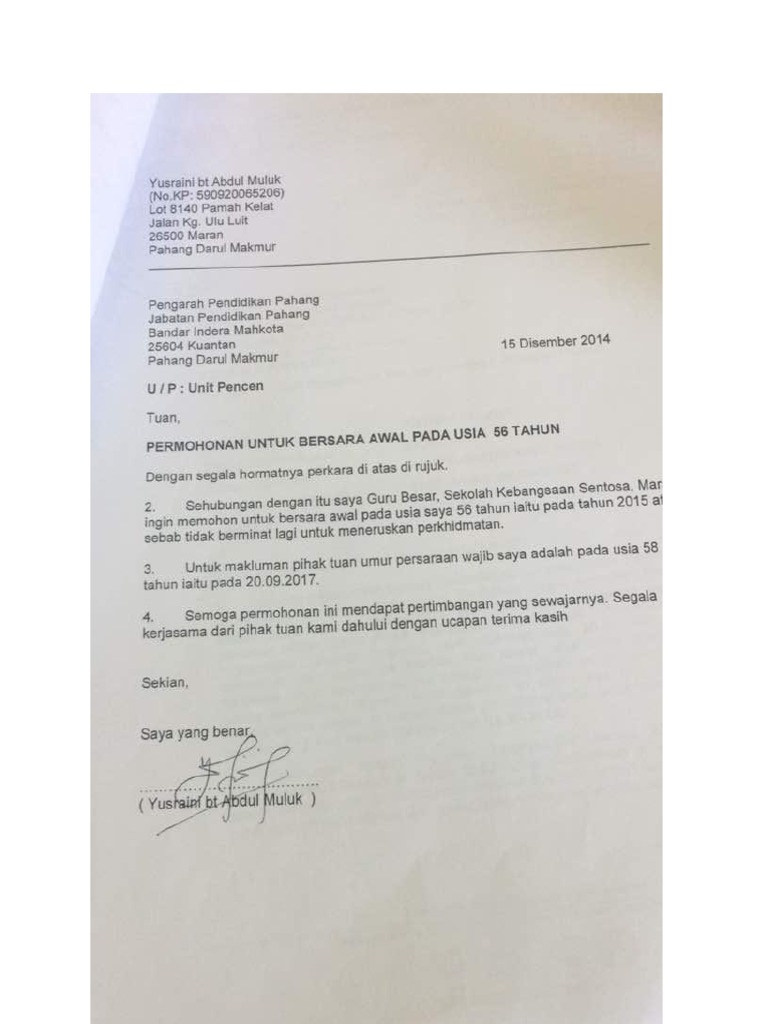 Contoh Surat Permohonan Bersara Pilihan Sendiri Contoh Surat Cute766 from cdn2.cute766.info 15 contoh surat permohonan izin untuk. Apabila mencapai umur 45 tahun bagi semua pegawai perempuan dan bagi pegawai lelaki di jawatan: Pegawai perkhidmatan bomba berpangkat rendah. Prosedur permohonan persaraan awal pilihan atas sebab kesihatan atau atas sebab sebab selain kesihatan di bawah seksyen. Nama penuh (seperti dalam kad pengenalan dan dengan huruf besar) ……………………………………………………………………………………………………….………………………………. 2 salinan sijil nikah daftar perkahwinan surat kematian surat cerai v 2 salilnan surat beranak anak anak dan salinan kad pengenalan jika ada. Contoh surat mohon bersara pilihan have a graphic from the other contoh surat mohon bersara pilihan it also will include a picture of a kind that might be seen in the gallery of contoh surat mohon bersara pilihan. Contoh surat persaraan # 1.